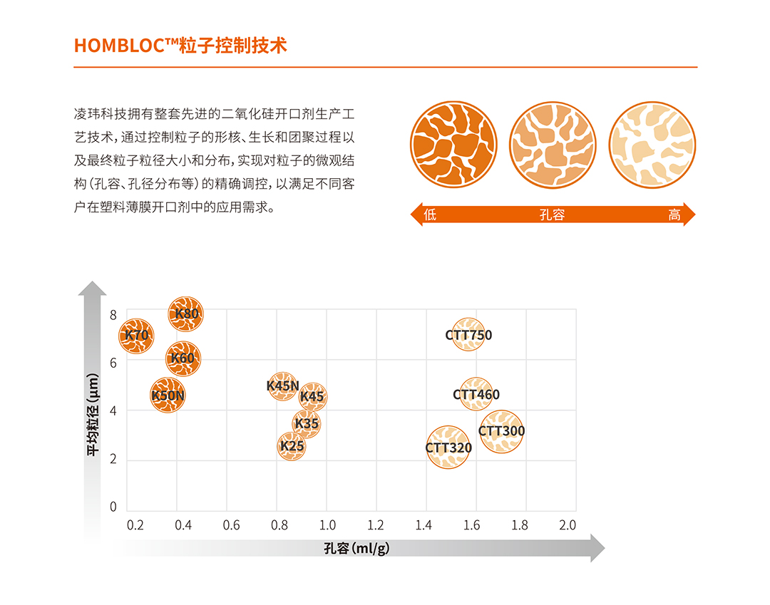 Polyethylene film (PE) : HOMBLOC™ has a purity of up to 99% to meet high concentration masterbatch requirements; Compatible with PE film resin, low staining risk. By controlling the particle size distribution, the accumulated net pressure of the extruder screen filter is reduced, and the service life of the extruder screen is effectively extended.Recommended models: K50N、K70、K80