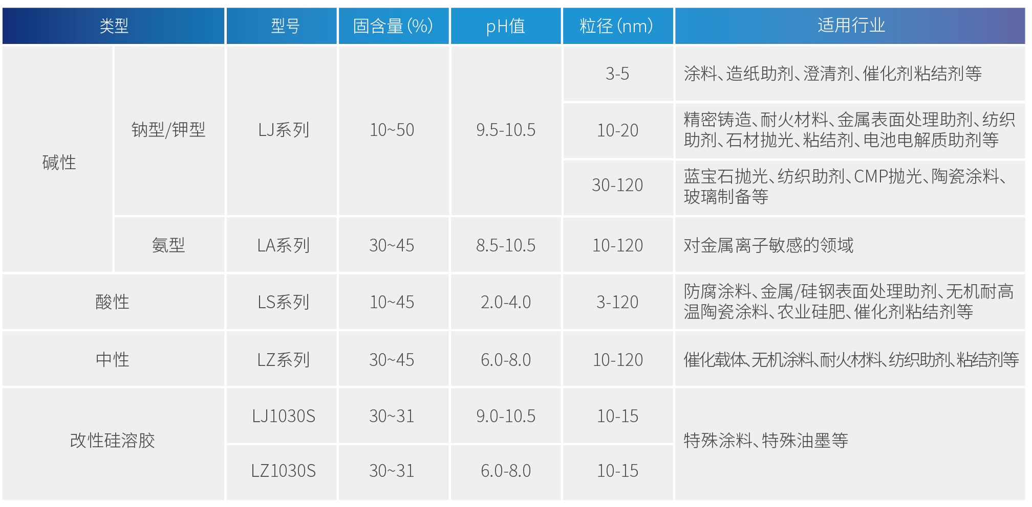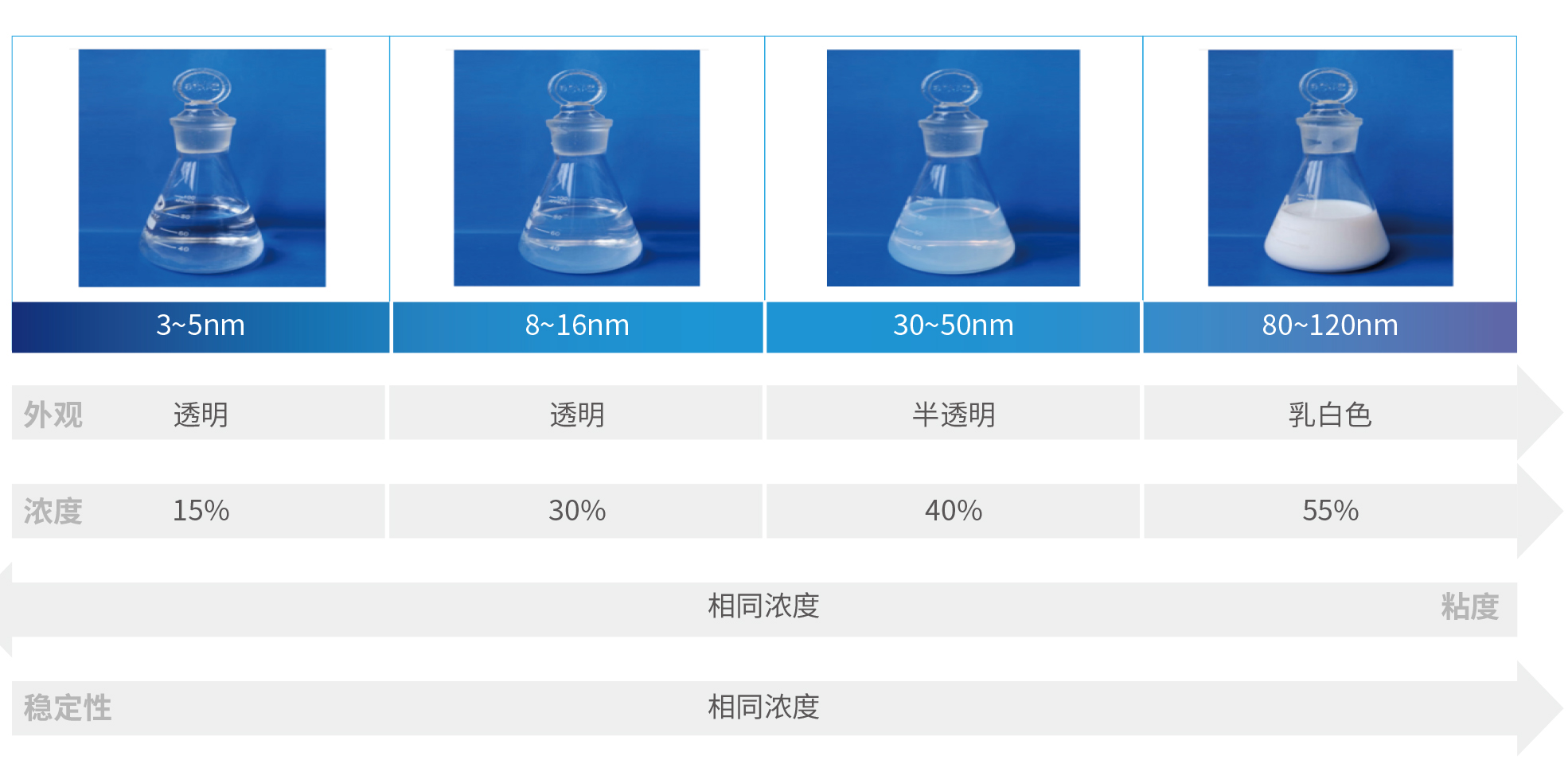 離子交換法:它采用水玻璃為主要原料,使其通過強酸型陽離子交換樹脂,除去水玻璃中的鈉離子和其他陽離子雜質,獲得稀聚硅酸溶液,通過晶種制備、粒徑增長反應和濃縮純化即可得到硅溶膠產品。 單質硅一步溶解法:以單質硅為原料,在無機或有機堿(如純氫氧化鈉)的催化作用下,將其與純水反應,制得硅溶膠的方法。 烷氧基硅烷水解法:通過對烷氧基硅烷,在酸性、堿性條件下水解,合成不同粒徑,不同二氧化硅含量的硅溶膠。